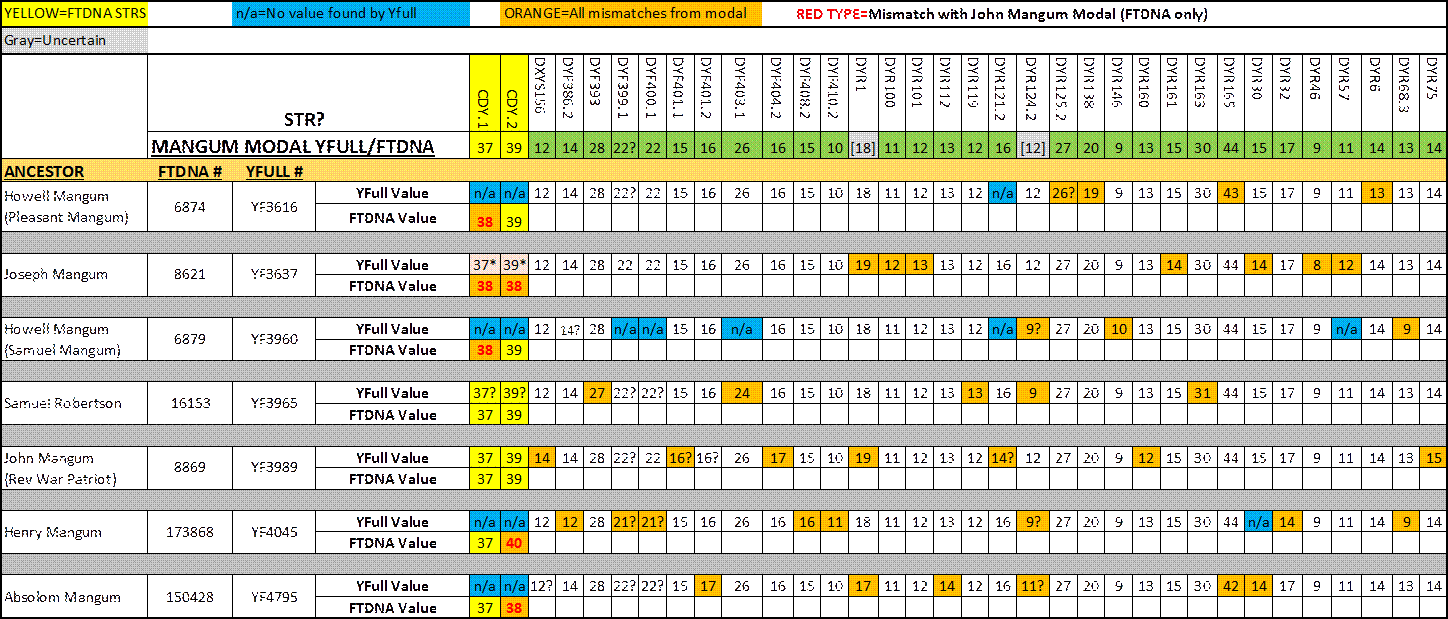 [16] We determine the Mangum modal as the majority marker value out of a group of participant’s results, and consider that this is the value passed down to us from John Mangum, our immigrant ancestor. This works well when we have many participants with a large majority having the same marker value, and only one or a few having a different value. The latter are therefore considered mutations from the modal. In a few instances, determining the majority value is difficult when there are only a few values available, as in some of the YFull results, and especially when those few values are varied. In some cases in YFull, we only have a single value, giving us a tentative modal value, but at very low confidence.