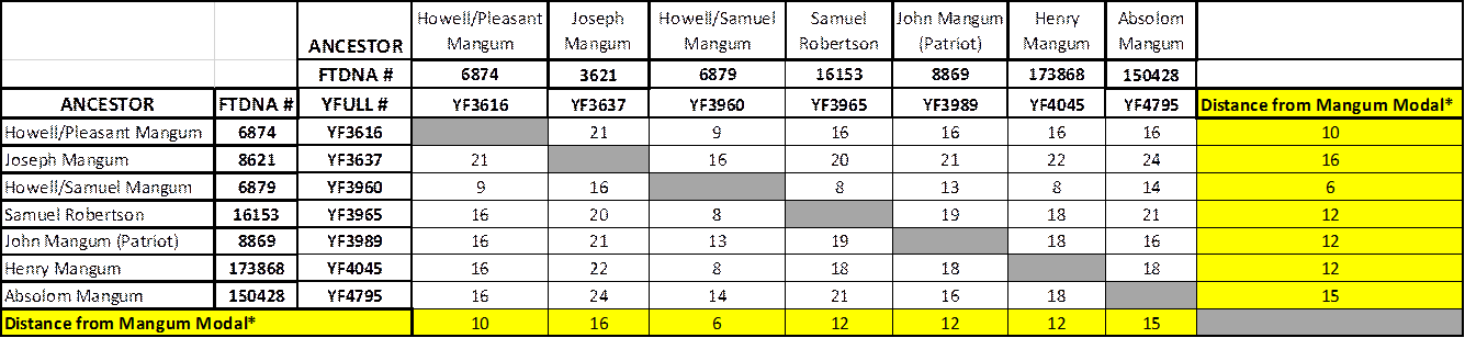 d. There are very few mutations in common (away from the Mangum modal) between the seven participants. This limits the info we can glean from the YFull data. However, the total number of marker mutations in each participant [distance] from the Mangum modal has been somewhat useful. The lack of common mutations is partly because we only have seven participants and their common ancestor is many generations in the past, close to the generations just after the immigrant ancestor John Mangum.