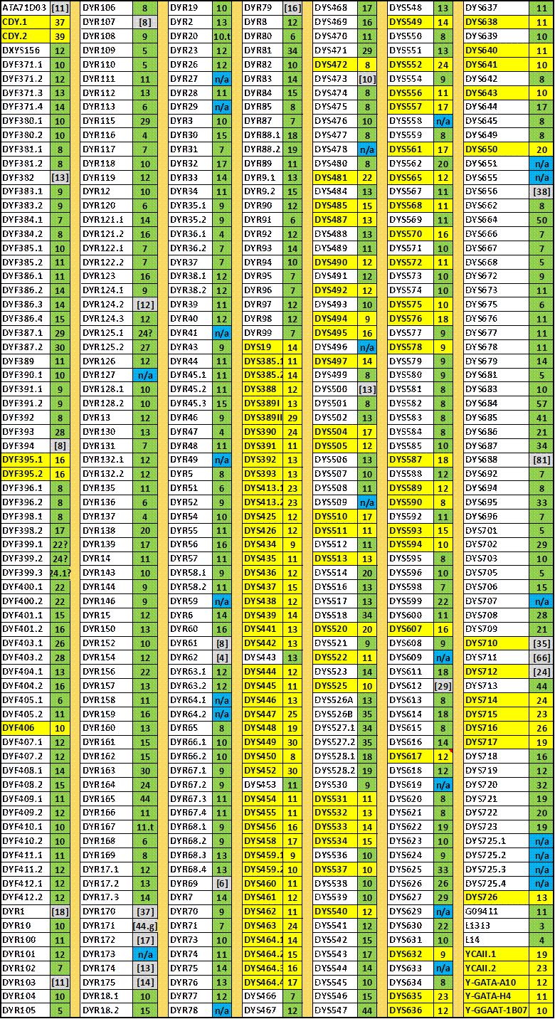 The first chart below shows the 504 YFull markers extracted, with the corresponding 111 FTDNA markers in yellow. “n/a’ means none of the YFull participants had a reported value at this marker. Beside each marker is the Mangum modal [in yellow (FTDNA) or green (YFull)], calculated from a combination of YFull and FTDNA marker values.