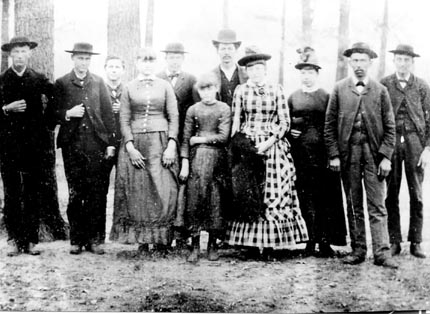 Left to Right - Rev. Sidney s. Key, Pastor at Oakland Methodist Church 1866-67, Unk, Unk, Martha Jane (Ford) Lavender, Silas H. James, Unk, William Buford Parsons, Unk, Martha Caroline Parsons James, Joseph Kirby parsons?, Unk. Photo c1867. Photo from Charlie Parsons, Holland, Arkansas.